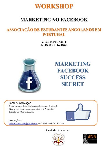 Convidamos todos os Estudantes, Sócios e Amigos, para Workshop de MARKETING NO FACEBOOK. Que será no dia 10 de Maio de 2014, pelas 14H30 Minutos na sede da Associação de Estudantes Angolanos em Portugal, sita na rua: Leopoldo de Almeida, Nº6-A